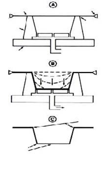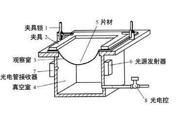 真空無模成型過程如圖2-2所示,將片材加熱到所需溫度后,置于夾持環上,用壓環壓緊,打開真空泵閥門抽真空,通過光電管控制真空閥調節真空度,直到片材達到所需的成型深度為止。由于自由真空成型法中制件不接觸任何模具表面,制件表面光澤度高,不帶任何瑕疵。如果塑料本自身是透明的,制件可以具有最小的光吸收率和透明性,故可用于制造飛機部件如儀器罩和天窗等。