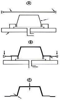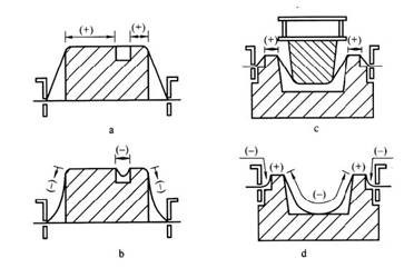 a 和b 陽模;c 和d 陰模 (+)模具面積,在該面積區域材料的有效成型壓力因接觸壓力而增加;(-)模具面積,在該面積區域有效成型壓力因成型材料的反向壓力而降低