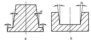對于陽模成型,制品會收縮而緊貼在模具上,而對于單腔陰模成型,制品收縮后可以脫離模具表面。為了能夠脫模,模具側面必須具有一定的傾斜度。在脫模方向上,模具側面的傾角被稱為脫模斜度(見圖2-13)。脫模斜度應該取得盡可能大。脫模斜度越大,脫模越快,成型周期越短,而且在脫模的過程中制品變形的可能性小。單陽模和單陰模的脫模斜度一般為:a=3o~5o ;對于收縮率<0.5%的和慢速脫模a > 0.50 。