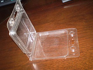 對折泡殼/對折盒:雙泡殼的一種,一張完整的泡殼通過中心的對折線折疊后,把產(chǎn)品和紙卡夾在當中,一般采用扣位和凹槽將兩邊泡殼對接在一起。這種泡殼的特點是后期包裝時可以不用封裝設備,但不適合比較重的產(chǎn)品包裝。